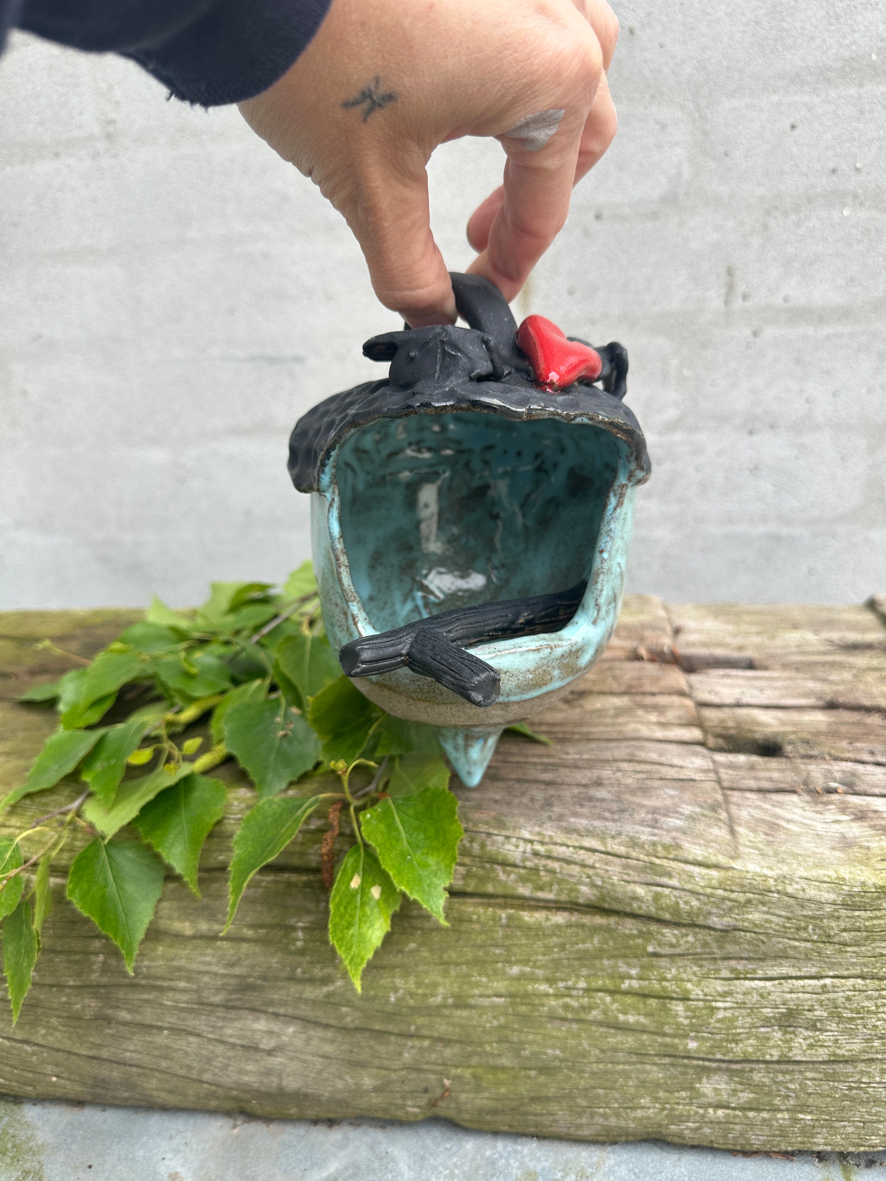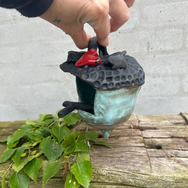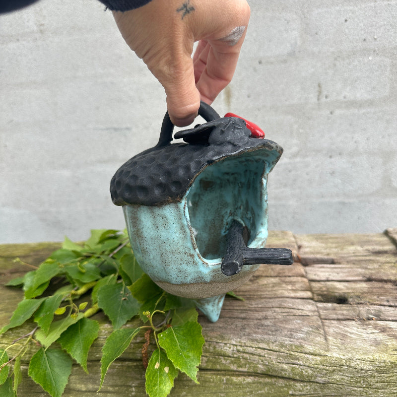 Hyggeligt lyseblåt fuglehus formet som et agern.