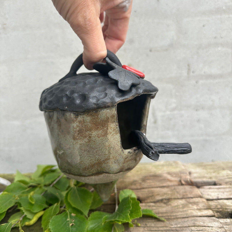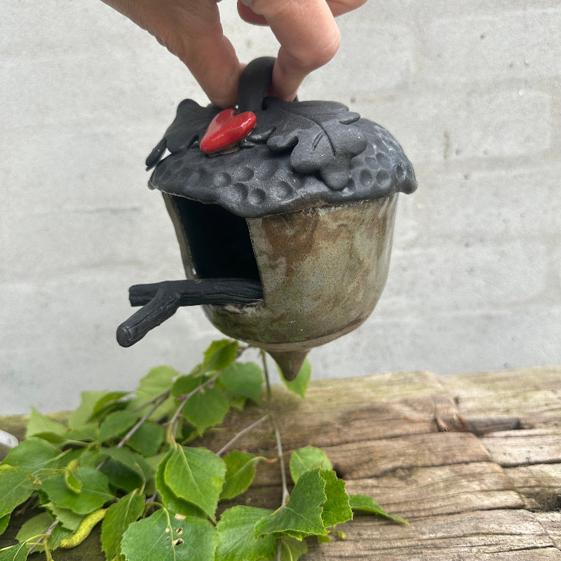 Lækkert grønt fugle foder hus. Formet som et agern.