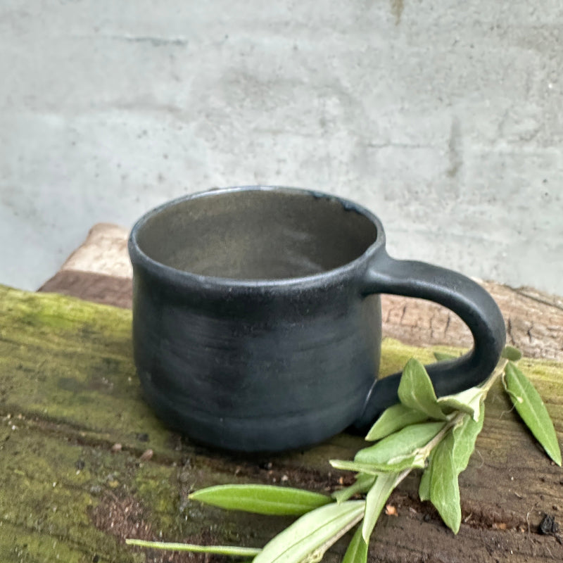 Mat sort kop med hank. Med en mørk grøn farve inden i.