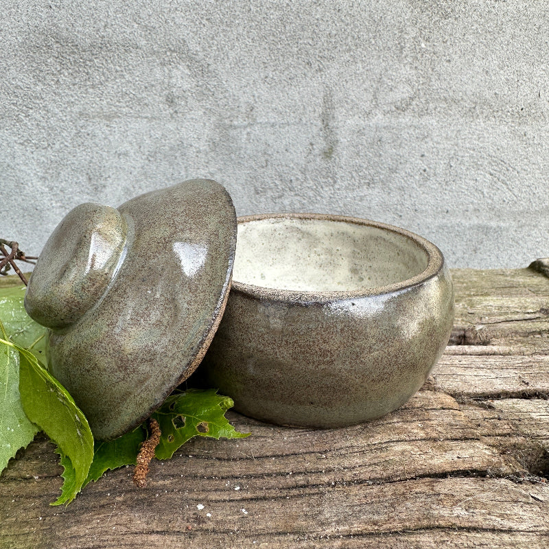 Smuk grøn krukke med låg med en lækker mat råhvid inden i.