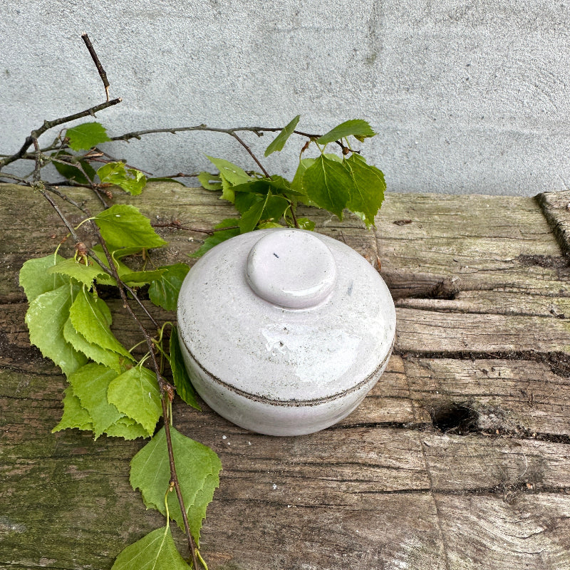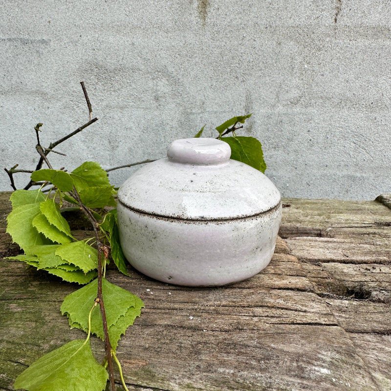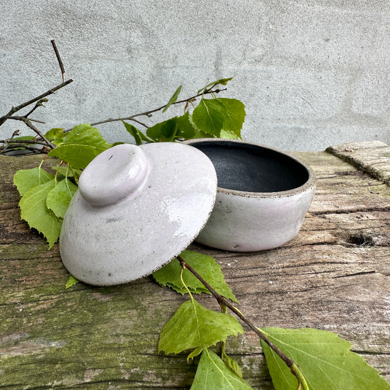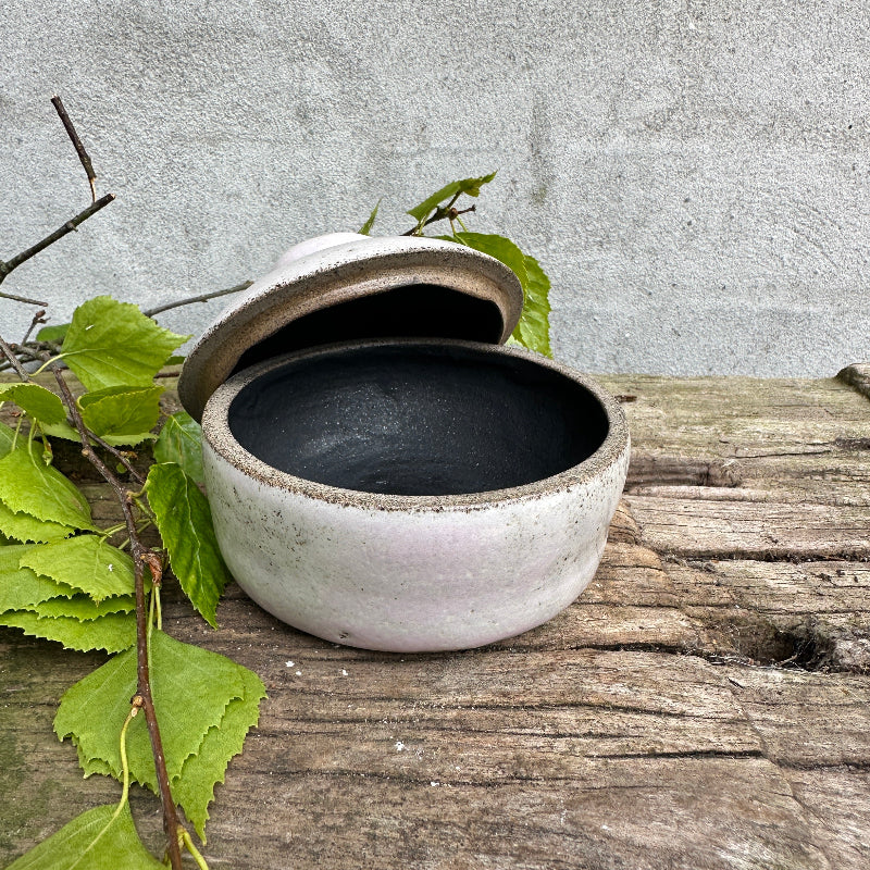 Fin lille lyserød krukke med låg. Med mat sort inden i.