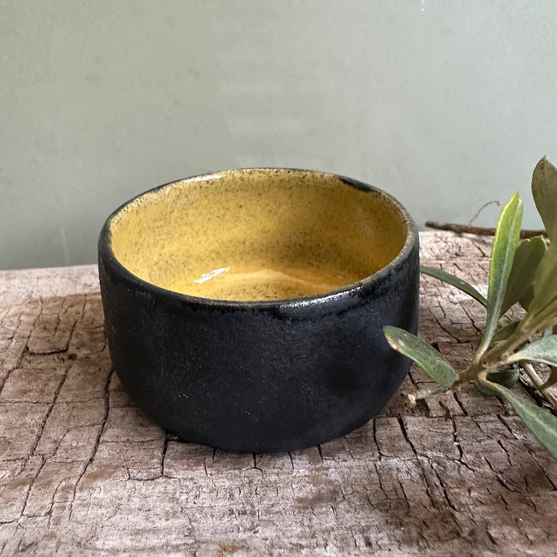 Fin lille snack skål. I mat sort med en lækker varm gul farve inden i.