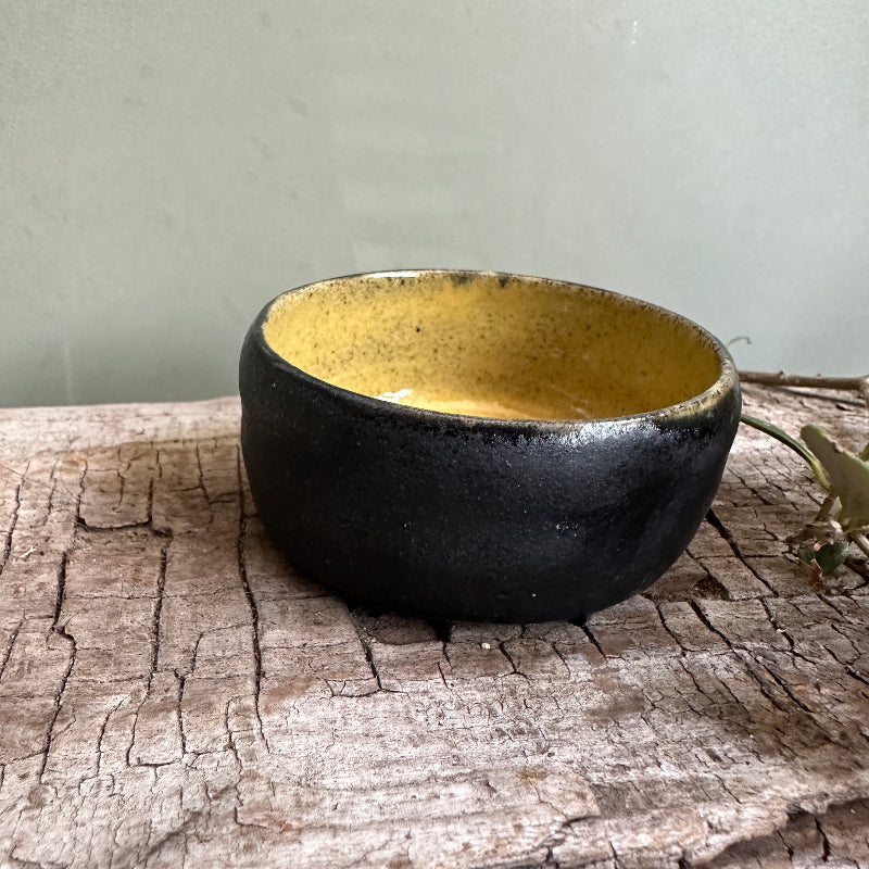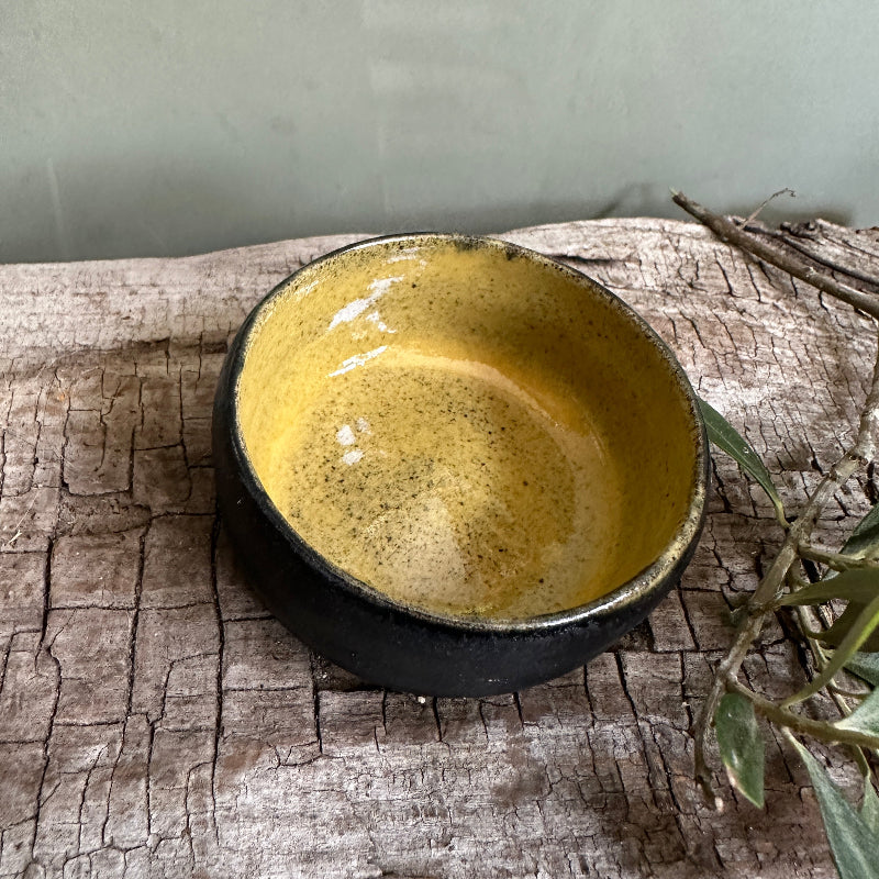 Fin lille snack skål i mat sort og en lækker varm gul inden i.