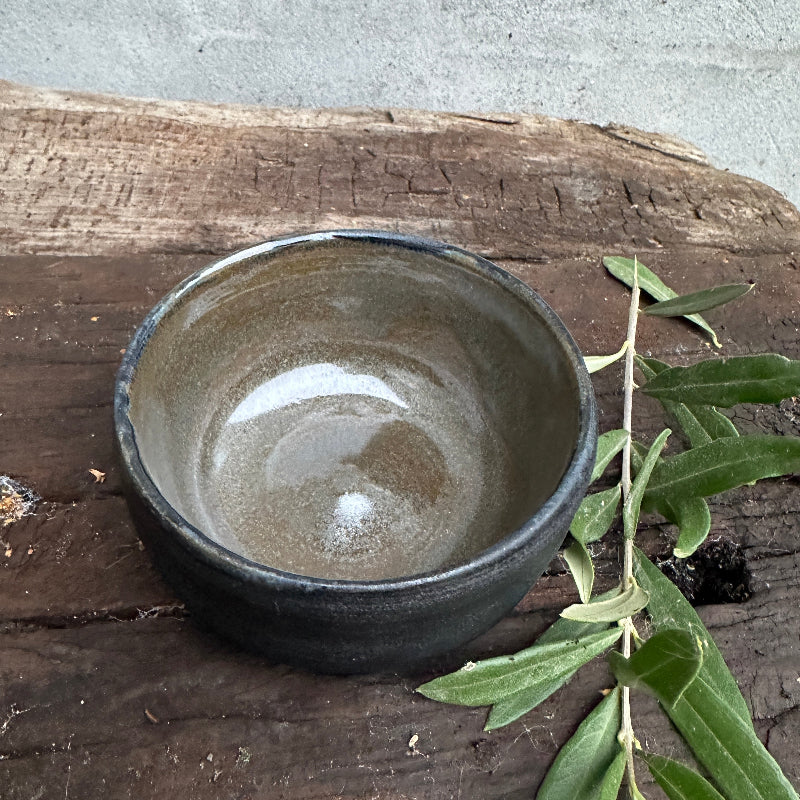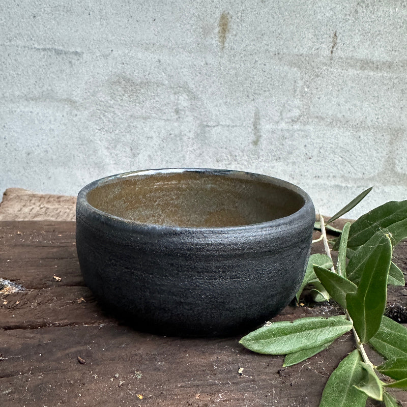 Superschöne mattschwarze Frühstücksschüssel mit einer köstlichen dunkelgrünen Glasur innen.