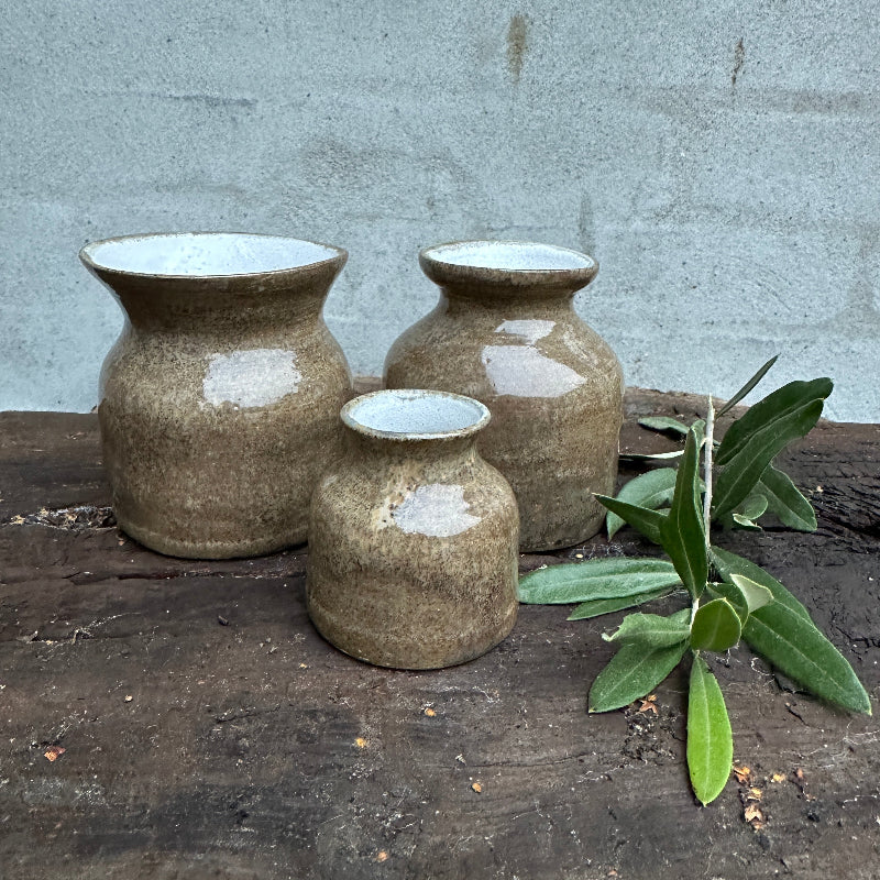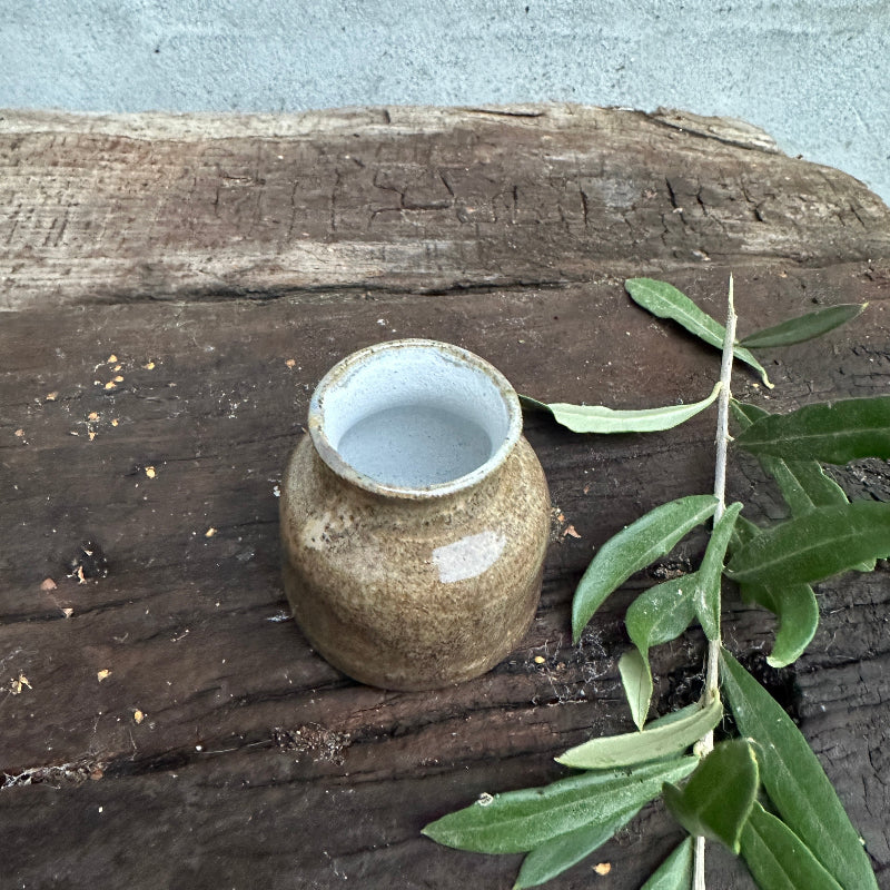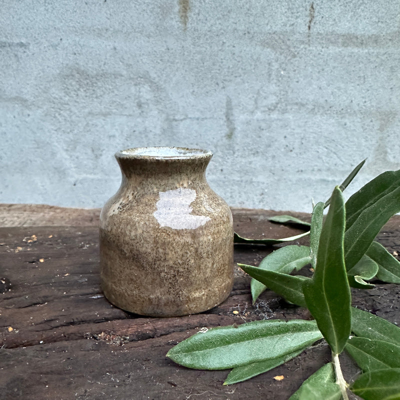 Kleine, feine hellbraune Vase. Innen ist es weiß.
